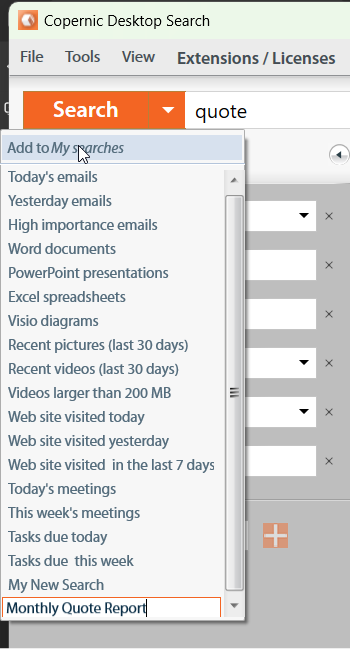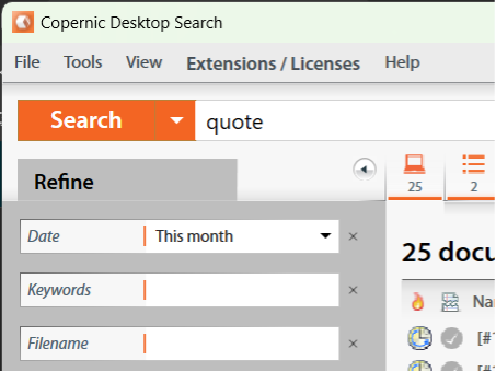 As an example, if you are responsible for assembling the quotes at the end of every month, you can enter “quote” in the search field and add “this month” as your refinement.