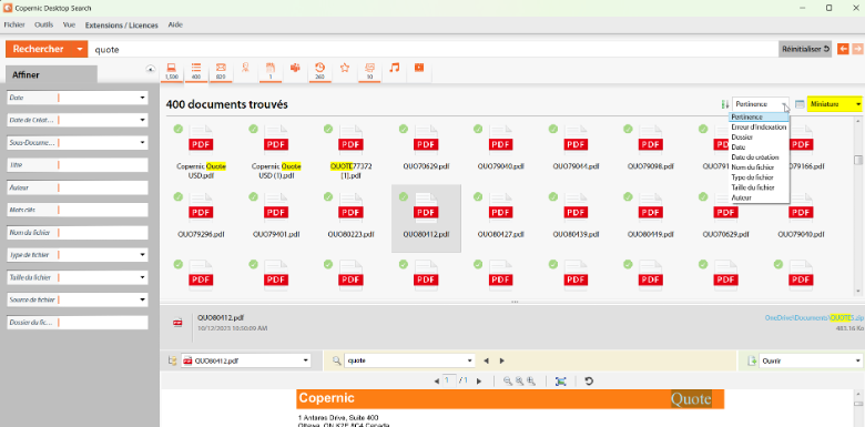 La vue « Vignettes » affichera les résultats sous forme de vignettes. Pour prévisualiser le fichier, cliquez sur la vignette et il s’affichera dans le volet de prévisualisation.