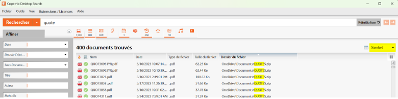 La vue par défaut est « Standard ». La vue Standard affiche vos résultats sous forme de liste et vous permet de prévisualiser un fichier en cliquant dessus.