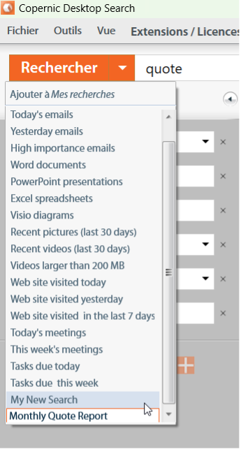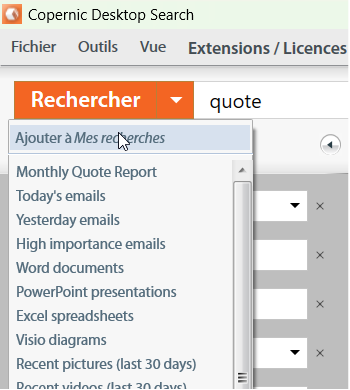 Copernic propose des recherches prédéfinies que vous pouvez utiliser comme raccourcis ou supprimer de votre liste pour la garder bien rangée.