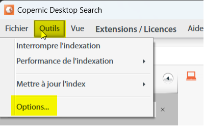 Vous devez redémarrer Copernic Desktop Search après avoir changé l’emplacement de l’index et une mise à jour de votre index sera nécessaire. Pour quitter complètement, cliquez sur Fichier -> Quitter.
