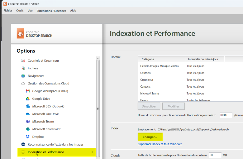 Cela garantit que tous les utilisateurs de votre ordinateur disposent de leur propre index personnel, stocké dans un emplacement non partagé. Si vous souhaitez déplacer vos fichiers de données d’index, vous pouvez suivre les étapes suivantes :