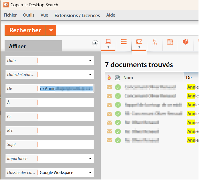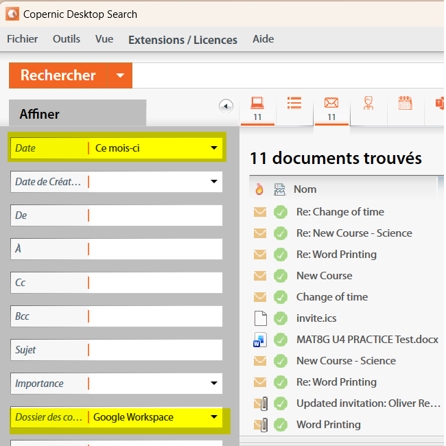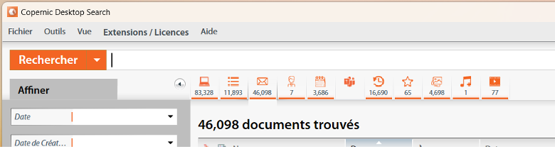 Pour rechercher dans vos courriels, vous pouvez sélectionner l’en-tête de la catégorie de courriels. Lors de la première recherche sans affinements, plus de 46 000 courriels sont indexés.