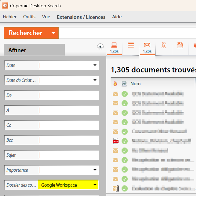 Vous pouvez affiner votre recherche en sélectionnant Google Workspace dans le filtre Dossier de courriels. Cela ramène vos résultats à 1 305 courriels.