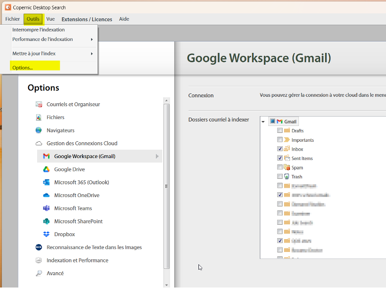 Maintenant que notre niveau Elite prend en charge Gmail, vous avez sans doute hâte de l’utiliser ! Pour y accéder dans vos paramètres, rendez-vous dans Outils -> Options -> Google Workspace. Suivez les instructions pour associer votre adresse Gmail ; cela impliquera probablement d’autoriser votre compte Google Workspace dans la section « Gestion des connexions cloud ». Une fois la connexion établie, vous pouvez sélectionner les dossiers de messagerie que vous souhaitez indexer en cochant la case située à côté de ces dossiers dans votre compte Gmail.