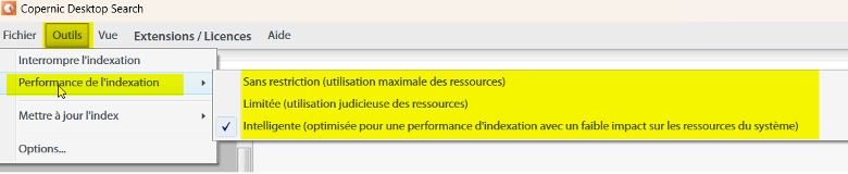 Il est important de noter que la première indexation peut prendre un certain temps, en fonction du nombre de fichiers que vous avez. Dans le menu Outils, vous pouvez sélectionner les performances d’indexation qui conviennent à vos besoins.