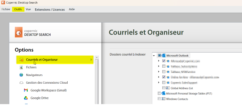 Dans le menu Outils > Options, vous pouvez sélectionner les courriels et l’organiseur que vous souhaitez que le système indexe. Vous pouvez également assigner les dossiers à indexer dans le menu Fichiers.