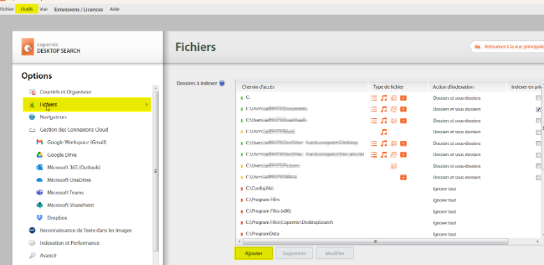 L’utilisation de la fonction « Ajouter » vous permettra d’ajouter les dossiers que vous souhaitez inclure dans l’index.