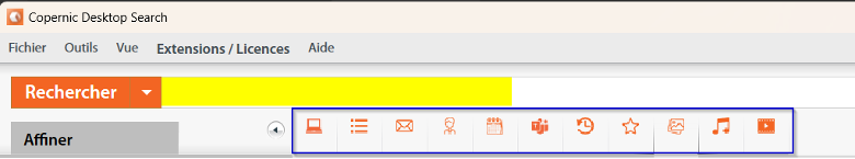 Une fois l’indexation terminée, vous pourrez commencer à profiter de l’efficacité et de la rapidité de Copernic ! Pour commencer, saisissez les mots-clés que vous souhaitez rechercher dans la barre de recherche (surlignée en jaune sur la capture d’écran suivante). Les icônes de fichiers (entourées en bleu) affineront davantage les résultats.